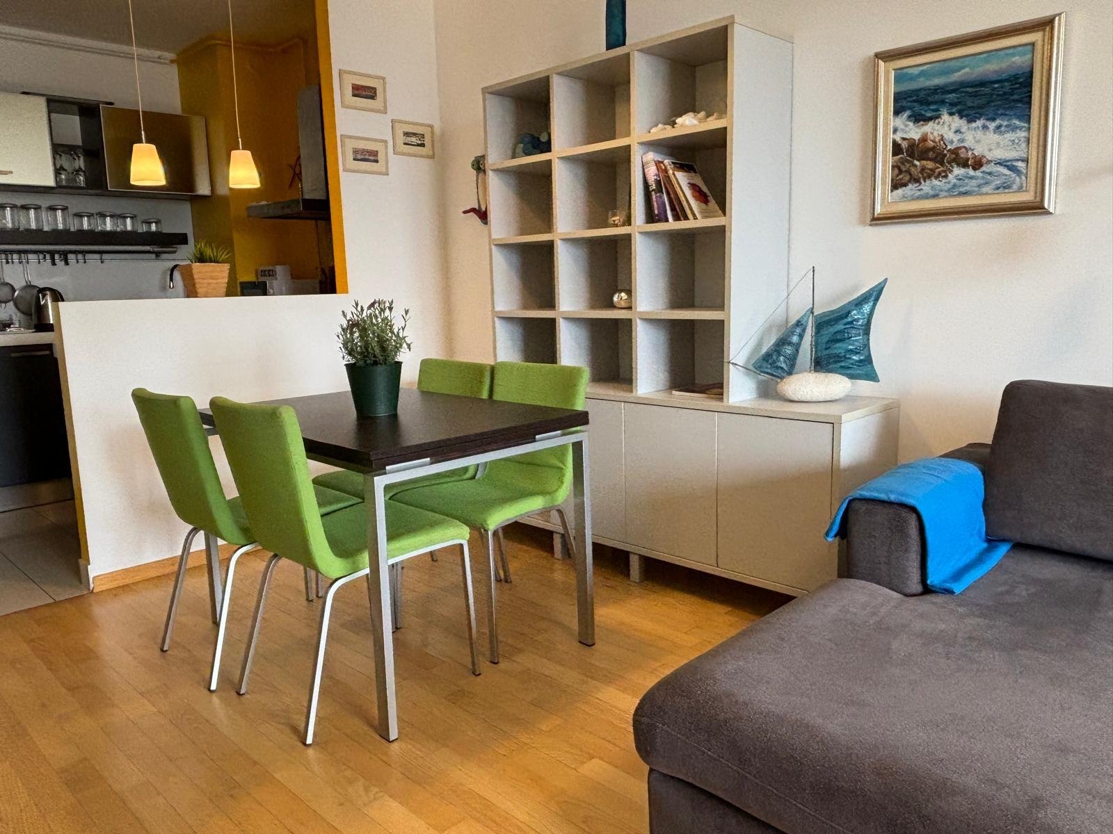 Our apartment features a comfortable one-bedroom setup, complete with a plush bed that promises restful nights. The living room, equipped with a sofa bed, provides additional sleeping space, making it ideal for small families or groups of friends. The open-plan living area is perfect for socializing, with ample seating, a flat-screen TV, and high-speed Wi-Fi to keep you connected and entertained.
